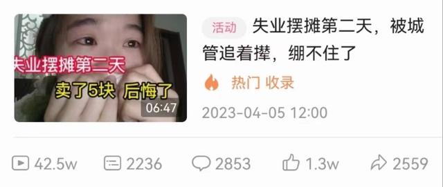 4月21日,“失业女生摆摊一天卖5块崩溃痛哭”话题登上热搜第一,话题阅读量达1亿+。