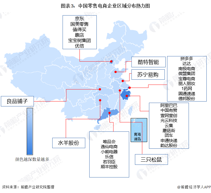 中国零售电商业务营收百亿元以上为:京东7458.02亿元、阿里巴巴5298.94亿元、苏宁易购2523亿元、唯品会1019亿元、拼多多594.92亿元、国美零售441.19亿元,分别占比40.84%、29.02%、13.82%、5.58%、3.26%和2.42%。