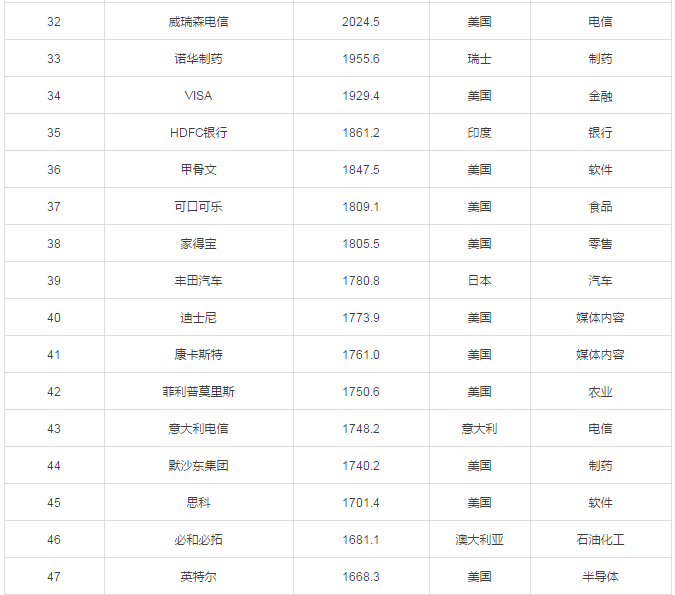 全球企业市值100强(3月版):苹果7398亿美元蝉联榜首