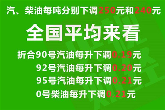 从全国平均来看,国内成品油的价格浮动具体情况如下:90号汽油每升下调0.19元,92号汽油每升下调0.20元,95号汽油每升下调0.21元,0号柴油每升下调0.21元。按一般家用汽车油箱50L容量估测,加满一箱92号汽油将节省约10元。