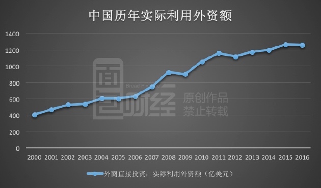 实际上,2016年全年,中国实际利用外资额就已出现罕见下跌,2016年中国实际利用外资额为1260亿美元,与上年相比减少约2亿美元。即便是扣除汇率影响,实际利用外资的增幅也在明显放缓,下图为面包财经根据商务部数据绘制的中国历年实际利用外资额:
