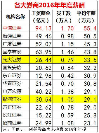 中国基金报统计显示,十大券商中除了 国信证券 外,其他券商都已经公布2016年年报,这些券商的2016年平均年薪全部低于华为。