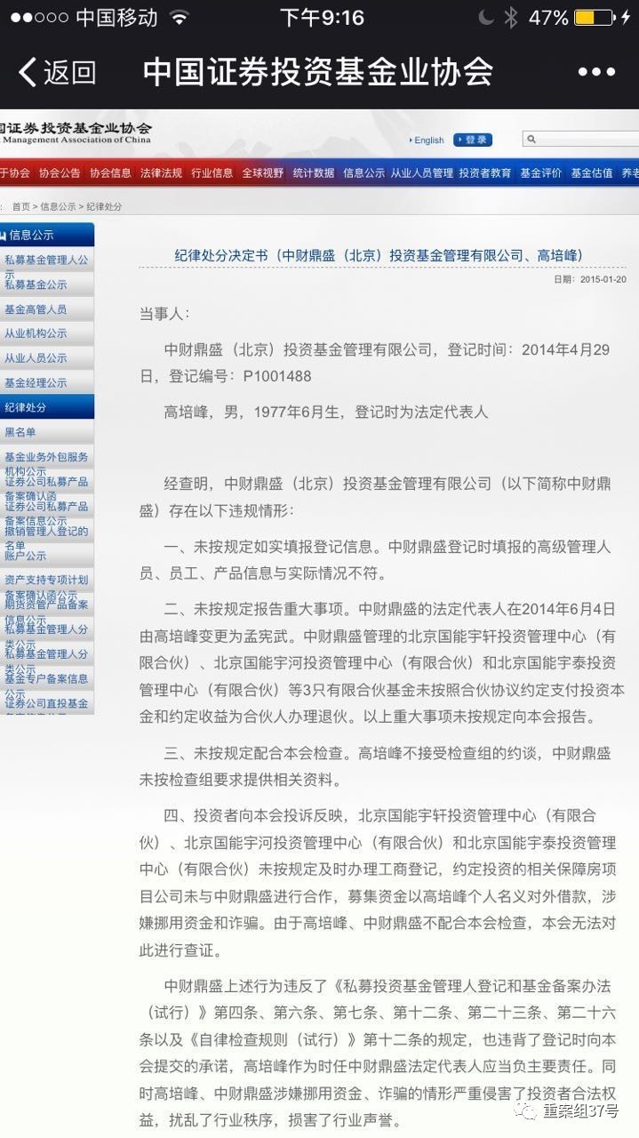 ▲中国证券投资资金业协会于2015年1月决定对中财鼎盛公司及其法定代表人高培峰公开纪律处分。