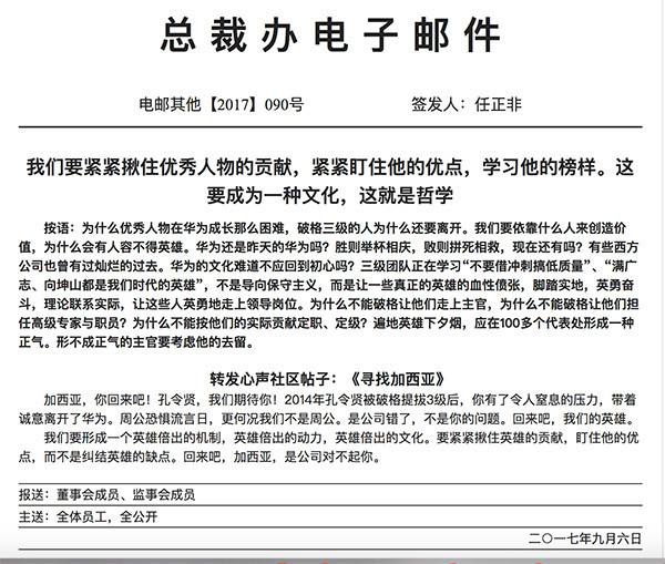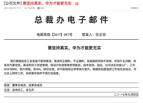 “为什么优秀人物在华为成长那么困难,破格三级的人为什么还要离开?”这些天,华为总裁任正非先是为一位敢于讲真话的员工破格晋升两级,接着又对一位两年前被破格提拔三级最终离职的员工事件进行了反思。9月6日,华为的内部论坛“心声社区”再次转发了华为总裁办的电子邮件,华为创始人、总裁任正非针对两年前被破格提拔三级的一位员工最终离职事件作出批示:我们要紧紧揪住优秀人物的贡献,紧紧盯住他的优点,学习他的榜样。这样成为一种文化,这就是哲学。两天前,9月4日,任正非同样为一位员工发了总裁办文件。这位名为“梁山广”员工面揭发了其所在部门的造假行为,被破格提拔两级,为免其在公司内部受到打击报复,让其自愿选择工作地点,并指定一位高层进行保护。9月4日,华为总裁办的文件名称为“要坚持真实,华为才能更充实”。邮件内容为:“我们要鼓励员工及各级干部讲真话,真话有正确的、不正确的,各级组织采纳不采纳,并没什么问题,而是风气要改变。真话有利于改进管理,假话只有使管理变得复杂、成本更高。因此,公司决定对梁山广,工号 00379880,晋升两级,到16A。即日生效。并不影响其正常考核与晋升。根据其自愿选择工作岗位及地点,可以去上研所工作,由邓泰华(华为无线产品线总裁)保护不受打击报复。”据了解,梁山广因揭发所在部门造假行为,承受了很大的压力,据说还遭到了人身威胁。随后,心声社区呼应任正非“讲真话”的批示,发出了“寻找加西亚”的文章。文章很简短,内容如下:加西亚,你回来吧!孔令贤,我们期待你!2014年孔令贤被破格提拔3级后,你有了令人窒息的压力,带着诚意离开了华为。周公恐惧流言日,更何况我们不是周公。是公司错了,不是你的问题。回来吧,我们的英雄。我们要形成一个英雄倍出的机制,英雄倍出的动力,英雄倍出的文化。要紧紧揪住英雄的贡献,盯住他的优点,而不是纠结英雄的缺点。回来吧,加西亚,是公司对不起你。华为员工对“孔令贤”的科普贴画像:孔令贤,知识青年、技术控;华为进入OpenStack社区第一人,OpenStack社区core member。在个人技术博客上发表专题博文150余篇,成功带领一支思想开放、融入开源社区并能够将开源和商业成果相结合的精兵团队,支撑华为成为OpenStack金牌会员,所带团队中有两名成员被评选为OpenStack core member。因贡献卓越,2014年被公司破格提拔升级。但这位应该前途无量的年轻人却在2015年选择离开华为。孔令贤后来在博客文章中称,被华为破格提拔变成了基层主管,华为对基层主管的要求是既要做管理,又要懂技术,在团队管理、业务扯皮,以及无休止的会议中,技术敏感度会严重下降,已经丧失了静心做技术的心,他已经感觉自己有这种趋势,对自己的未来感到迷茫,最终选择离开了公司。心声社区微信公众号文章发出后,已经移民新西兰的孔令贤在微博上进行了回应:加西亚已收到,没有谁对不住谁,华为是民族企业的骄傲,提起华为我依然自豪,希望以后还能有合作的机会。9月6日,华为总裁办的电子邮件内容如下:按语:为什么优秀人物在华为成长那么困难,破格三级的人为什么还要离开。我们要依靠什么人来创造价值,为什么会有人容不得英雄。华为还是昨天的华为吗?胜则举杯相庆,败则拼死相救,现在还有吗?有些西方公司也曾有过灿烂的过去。华为的文化难道不应回到初心吗?三级团队正在学习“不要借冲刺搞低质量”、“满广志、向坤山都是我们时代的英雄”,不是导向保守主义,而是让一些真正的英雄的血性偾张,脚踏实地,英勇奋斗,理论联系实际,让这些人英勇地走上领导岗位。为什么不能破格让他们走上主官,为什么不能破格让他们担任高级专家与职员?为什么不能按他们的实际贡献定职、定级?遍地英雄下夕烟,应在100多个代表处形成一种正气。形不成正气的主官要考虑他的去留。上述华为内部人员对澎湃新闻记者表示,两起事件应该是相关联的,一个是鼓励大家讲真话,一个是让企业能够留住人才。“企业大了,就会有很多大企业病,空话、假话就会多,气氛也会变,但公司还是一直想提倡大家将真话、实话的。”一位员工在心声社区留长文其中提到:看到总裁办邮件后,我所在的办公区内一片欢呼,直呼“牛逼”。有人留言称:希望公司能不亏待那些有能力、真正为公司着想,做出成绩或贡献而又比较正直、耿直、不会拍马屁的人!华为还是昨日的华为吗?如今的华为已经成长为一家巨型科技公司。2017年上半年华为实现销售收入2831亿元,同比增长15%,营业利润率11%。