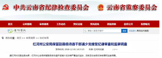 被带走后,老母亲被气死2018年12月1日,红河州纪委监委发布消息:红河州公安局保留副县级待遇干部浦少龙涉嫌严重违纪违法,目前正在接受纪律审查和监察调查。浦少龙被带走后,老母亲被气死。法庭上,浦少龙说,2011年12月1日,他到元阳县政府报到;2012年1月份,任元阳县公安局局长;2016年4月,他调离元阳县公安局局长。“因为我的过错,我被监察委带走留置后,老母亲知道后被气死了。我当时很后悔,因为我的过错,给家人带来不幸。”说到这里,浦少龙当庭大哭称对不起家人……