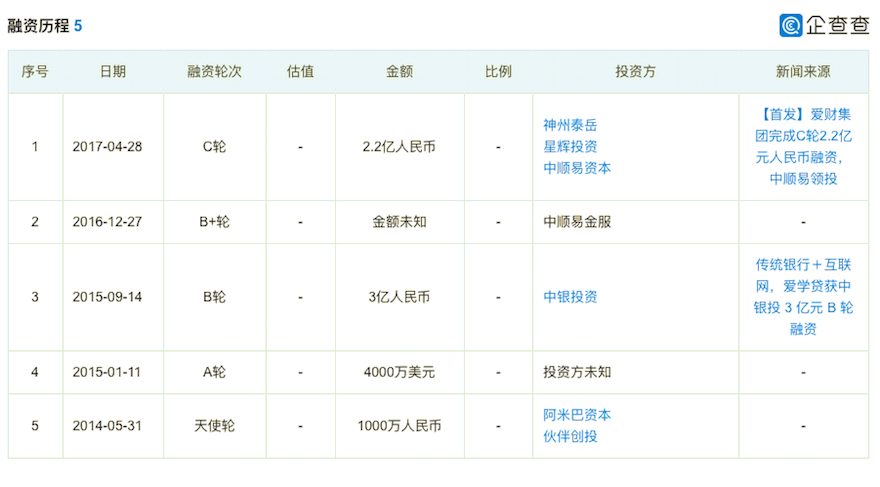 截至目前,爱财集团已经完成四轮融资,融资总额5.7亿元。2014年9月,公司成立之初,获得来自吴泳铭、戴志康、李治国三位天使投资人1000万元的天使轮投资;2015年1月,获得上市公司神州泰岳4000万元的A轮投资;2015年9月,获得中银投资浙商产业基金领投的3亿元的B轮投资以及中国银行50亿授信额度;2017年4月,完成中顺易金服领投的2.2亿元C轮融资。