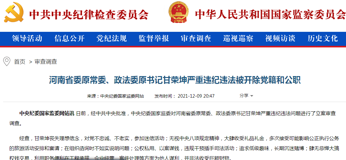 此前,12月9日,中央纪委国家监委网站通报甘荣坤被“双开”。