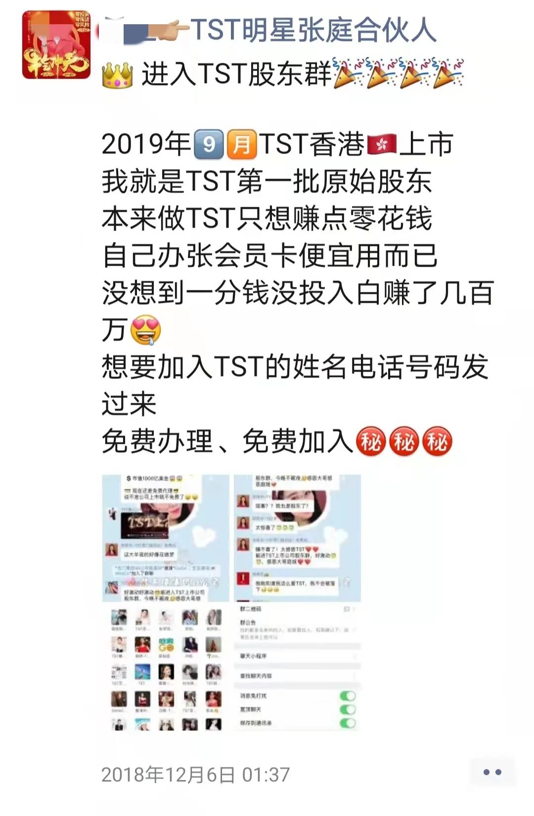 花30万可成为“董事长”,组建自己团队赚提成2016年,孙琦经朋友介绍,加入TST。朋友告诉她,在TST赚钱特别多,一年能赚十几万、二十几万,而且不用投钱。朋友的解释是:“TST是明星老板,人家根本不差钱,光分享就行了。”孙琦随后被拉入各种TST家族微信群。孙琦说,自己的上家有群,上家的上家有群,再往上还有群,华北大区也有群。公司还有精英群,大健康群,护肤群……据她介绍,最开始时为了吸粉,微信群中会打出“花19块钱运费,拿价值300多元礼包”的旗号,拉人进群。群里还不断有励志案例分享:有人年赚五六百万,有大学老师辞职加入TST,没有文化的农村宝妈也能挣到钱……做代理的第一步是发朋友圈,按照朋友教她的方法,每天复制微信里别人发的文案、图片,照着转发就行。但朋友告诉她,发朋友圈只能赚点零售钱,要想赚更多的钱,得开卡,“开卡之后,别人买东西你就能挣钱。”开卡是有条件的,先买2500元产品。孙琦介绍,TST公司将代理分为“蓝卡”和“红卡”。蓝卡代理是不具备开卡资格的人,红卡拉人有提成,才能挣钱。2020年TST内部红卡奖金制度。 受访者供图诱惑是一步步升级的。升级成“红卡”后,孙琦开始不断拉人。但几个月之后,孙琦发现自己也没挣着钱,她好奇群里每天宣传的“买房买车,赚大钱”的人是如何挣到这么多钱的。朋友告诉她,这得需要成为团队长,孙琦发展100个人,然后这100个人每个人发展10个人……这样儿子辈、孙子辈挣钱孙琦也能拿到返利。不光这样,孙琦朋友劝她去成立公司,做董事长,成为“TST创始人”。“ 她跟我说,成为董事长,可以跟明星合影,跟老板合影,圈层都变了。”成为董事长需要连着三个月,每月买10万元产品。孙琦在三个月的时间里,将信用卡、花呗、借呗等各个平台能贷出来的钱,都贷了一遍,凑钱完成要求。第四个月,孙琦被允许“裂变”,成立了自己的“家族”,成为董事长,利用原本和朋友合开的公司,与TST公对公走账。TST“合伙人”在朋友圈称免费加入。 受访者供图“董事长”团队每月需完成25万业绩,主要靠自己垫钱囤货成为“董事长”后,家族团队是有业绩要求的,孙琦称,每个月团队业绩要达到25万以上,达不到,就拿不到高提成和返利。很快,孙琦就意识到提成和返利不是那么好拿的。她解释称,代理都知道上级代理有返利,因此谁也不愿意原价买,上级代理只能将产品打折给到下一级,如果价格不够低,人家就去其他人那里买了,自己团队也完不成业绩。为了完成业绩,她只能不断囤货。孙琦说,每个月压力都特别大,家里囤得到处都是货,跟老公吵架,孩子也顾不上管。孙琦表示,公司虽然声称不允许囤货,但会通过搞活动的方式,刺激代理囤货。“搞活动的时候,在群里不断晒单、截图,说谁买了多少多少,再不买没了,为了低价拿到货,只能参加活动囤货。”TST内部创始人加级奖励制度。受访者供图囤货的分销需要更多人来承担。为此孙琦只能“玩命儿地”让下级代理囤货、裂变,“只有下级代理的业绩高,我才能挣钱。下级代理要想赚钱,只能不断拉人。”同时,她按照朋友当初拉她入伙的模式,套路别人,“激发别人当董事长的梦想,囤货,卖货。”最终,她成功发展两个人成为董事长。终于,孙琦账面上每个月能收到几万块钱。TST公司返给孙琦的钱,以服务费的名义通过对公账户打过来。孙琦解释说,这其实是她的“子子孙孙”购买产品的提成。但她盘算完发现,自己仍然没有挣到钱。买来的货都打折低价卖出,相当于自己垫钱拿货,“100块钱买的东西,60块钱卖,返利的40块钱下个月发给我,就说是我挣的,但发的钱基本都是我自己垫的钱。”孙琦意识到,自己被“一步一步套路”,2021年年初,囤的货甩得差不多之后,孙琦彻底决定不再做TST。而被孙琦发展的两名“董事长”,也因为挣不到钱退出。孙琦说,这几年的经历总结起来就是,“只在朋友圈看到有人挣钱,反正自己和身边的人都没有挣到钱。”TST内部群,群成员称“培养更多创始人”。 受访者供图