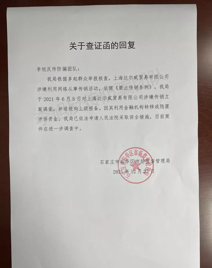 创始人明星效应加持,涉嫌传销被查据TST官网显示,“TST庭秘密”品牌隶属于上海达尔威贸易有限公司,由林瑞阳、张庭于2013年创立,以化妆品、护肤品为主打品类。孙琦称,TST产品基本为代工厂加工,她曾在网上搜索发现,其中一款TST面膜的代工厂成本价约为一盒20元,而售价高达148元,产品利润巨大。明星创始人也成了品牌宣传、拉人的加持。代理买够两万元能跟老板合影,加“大哥”林瑞阳微信,进入精英群,而在精英群里老板娘张庭、“大哥”林瑞阳每天早晨给大家开文字早会。孙琦说:“我后来才知道,那根本不是老板微信,只是挂了老板的图片当头像,助理在运营。”2020年,张庭转战抖音开启直播带货时,还从TST家族群中拉人到抖音直播间,让代理们高价购买产品,再返现金券,“有谁不去买,老板娘说话就非常难听。”12月23日,李旭反传防骗团队“关于请求石家庄市裕华区市场监管局查证TST是否涉嫌传销,是否立案调查查证函”。 图源:李旭反传防骗团队TST也多次陷入涉嫌传销的争议,据李旭反传防骗团队介绍,近年来,其团队多次收到关于TST平台涉嫌传销的举报信息。李旭告诉新京报记者,诸多网友反馈,TST存在入门费,多层级团队计酬机制。在TST平台,很多代理为了赚钱不断拉人,成立新公司,疯狂发展下线,砸钱囤货,其营销模式疑似涉嫌传销。李旭团队将上述情况以《关于请求石家庄裕华区市场监管局查证TST是否涉嫌传销,是否立案调查查证函》的形式,反映给有关部门。12月23日,石家庄市裕华区市场监督管理局回复李旭反传防骗团队查证函称,根据多起群众举报核查,上海达尔威贸易有限公司涉嫌利用网络从事传销活动,依据《禁止传销条例》,于2021年6月5日对上海达尔威贸易有限公司涉嫌传销立案调查,并逐级向上级报备。因上海达尔威贸易有限公司利用金融机构转移或隐匿涉传资金,石家庄市裕华区市场监督管理局已依法申请人民法院采取保全措施,目前案件在进一步调查中。12月29日凌晨,“TST庭秘密”在微博发文:“上海达尔威贸易有限公司是一家合法经营的公司,自成立以来始终遵从政府指导,坚持合法经营,依法纳税。非常感谢河北石家庄政府指导我司排查风险,目前公司运营一切正常,我司将积极配合相关部门工作。”张庭、林瑞阳也转发该微博回应。12月29日凌晨,“TST庭秘密”在微博发文回应。 来源:TST庭秘密官方微博29日上午,李旭告诉新京报记者,李旭团队早已注意到TST涉嫌传销的事,2021年上半年,通过内部渠道了解到该公司被立案调查,在自媒体平台发此消息后被TST公司以“影响名誉权、商誉、不实”等原因投诉,文章、视频下架。23日,李旭反传销团队收到石家庄裕华区市场监督管理局盖章函件,证实上海达尔威贸易有限公司涉嫌传销被立案调查,但相关文章发布出去之后依然被投诉。李旭表示,根据《禁止传销条例》,传销一般有三个特征:一是有入门费,需要缴纳一定费用,或者认购一定的产品,取得入门资格,也就是变相的入门费;二是拉人头,发展上下线的关系,形成团队;三是团队计酬,直接或者间接以发展的人数、销售业绩发钱。李旭表示,在这样的模式中,公司、团队长等有返利,但他们一般不会公开奖金模式,这也是非常狡猾的地方,这种行为模式也触及到法律红线。在这种模式之下,底层的参与者成了接盘侠。