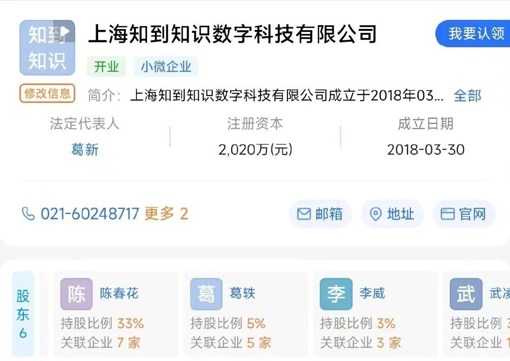工商查询显示,陈春花占有该公司33%股份,关联7家企业。