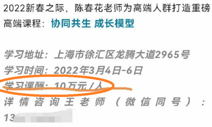 所以你说陈春花是教授、商人,还是打着教授名号的商人?这样一门课就能卖到每人10万元。