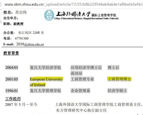 再比如,上海外国语大学工商管理系主任苏宗伟副教授,也是爱尔兰欧洲大学2001年的工商管理博士,和陈春花同期同专业,不仅是校友,还是同班同学,如果有班的话。