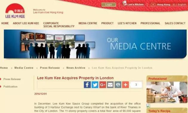 根据英国地产网站CoStar于2016年12月1日的报道,李锦记以3700万英镑(约合人民币3.26亿元)的价格成功购得东伦敦South Quay地带的“港口交易所3号”大楼(3 Harbour Exchange)。