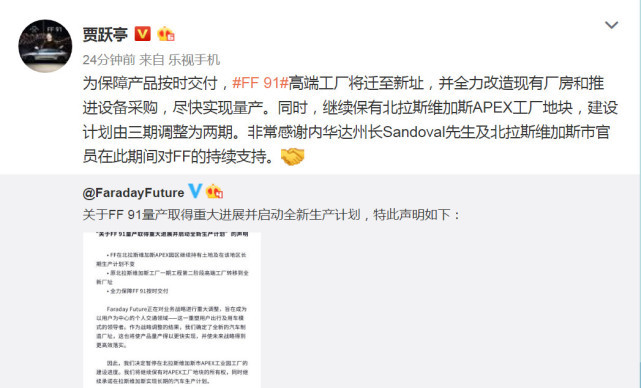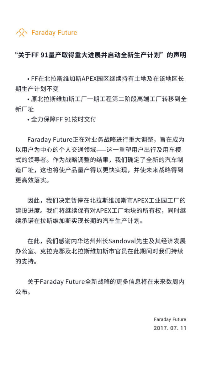 贾跃亭今日中午通过微博发文称,为保障产品按时交付,FF91高端工厂将迁至新址,并全力改造现有厂房和推进设备采购,尽快实现量产。同时,继续保有北拉斯维加斯APEX工厂地块,建设计划由三期调整为两期。非常感谢内华达州长Sandoval先生及北拉斯维加斯市官员在此期间对FF的持续支持。