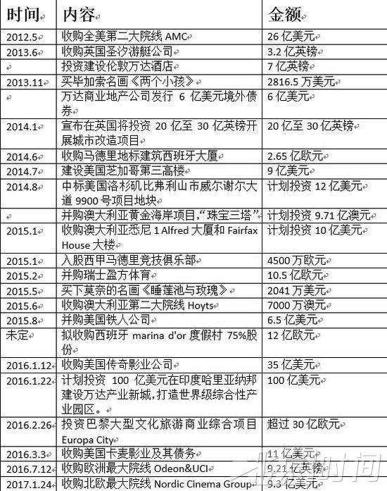 据澎拜新闻统计,而自2012年万达在海外的第一笔收购--26亿美元收购全美第二大院线AMC开始,截至目前,万达在海外的投资总额已高达2451亿元。这其中还不包括王健林曾宣布的今年万达要在海外落地的两个超过百亿美元级别的项目,一个是马来西亚的大马城,还有一个项目在印尼。