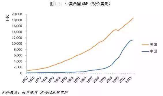 从GDP总量来看,根据世界银行公布的数据,按现价美元计算,2016年中国的GDP为11.20万亿,居世界第二,美国为18.57万亿,尚有7.37万亿的差距,我们预测中国的经济总量超过美国仍需十年以上的时间。