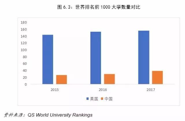 高等教育是一个国家教育实力的综合体现。从QS世界大学排名来看,中国顶尖高校的整体实力远不如美国。近三年来,中国平均每年有32所高校入围世界排名前1000高校名单。2017年最多,有39所,排名最靠前的清华大学位列名单第25位;而美国平均每年有152所大学入围,2017年高校数量达157所。中美高等教育的之间巨大差距有历史原因,冰冻三尺非一日之寒,中国教育水平想超越美国仍有很长的路要走,为山九仞,岂一日之功。