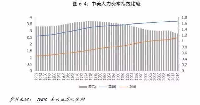 人力资本可被定义为人类所拥有的知识和有效运用这些知识的能力。人力资本对经济发展作用已有公论,从图中可以看出中美人力资本的差距在改革开放之前不断增大,改革开放后逐渐缩减,但差距仍然明显。从供给侧来看,未来我国面临人口老龄化危机,人口红利消失后更凸显人力资本的重要性;从需求侧来说,我国实现高质量增长和经济结构转型也需要更多高素质人才。十年树木,百年树人,我国需要进一步加大对教育的投入,提高人口素质与人力资本水平。