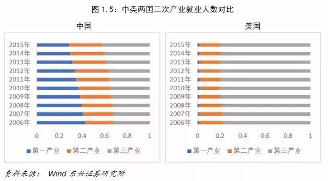 产业结构高度化也称产业结构高级化。指一国经济发展重点或产业结构重心由第一产业向第二产业和第三产业逐次转移的过程,标志着一国经济发展水平的高低和发展阶段、方向。从劳动力分布来看,近10年来中国的第一产业就业人数平均占比为35.54%,第二产业为28.48%,第三产业为35.98%;美国的第一产业就业人数平均占比为1.53%,第二产业为18.95%,第三产业为79.52%。中国进步虽快,但差距依然明显。