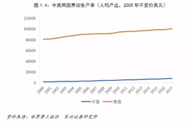劳动生产率由一定时期内劳动者的劳动成果和其相适应的劳动消耗量的比值计算得到,可以用单位时间内所生产的产品的数量或价值来表示。根据世界劳工组织的测算,21世纪以来,中国的劳动生产率从2000年的2023美元跃升至目前的8253美元,而美国的劳动增长率2000年就已达到81316美元,2017年已突破十万元大关,为101101美元。中国虽然增长显著,但目前的劳动生产率尚不足美国的10%,生产力有待进一步解放。