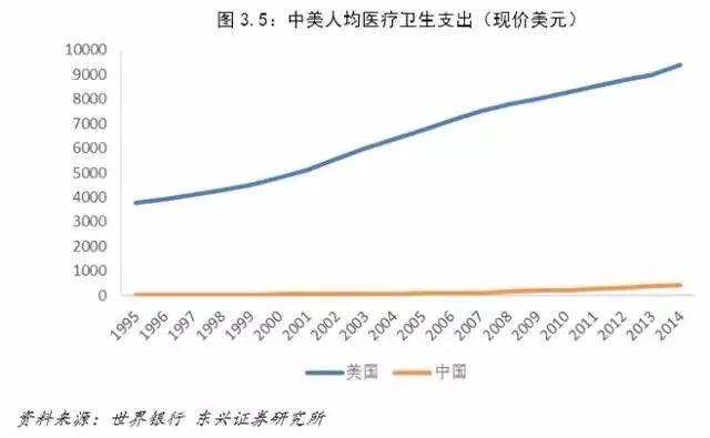 人均医疗卫生支出可以用来衡量一国居民的医疗保障水平。从世界银行的数据来看,中国人均医疗卫生支出远落后于美国,2014年为419美元,美国的人均医疗卫生支出稳步上升,2014年美国人均医疗卫生支出达到9402.5美元,是中国的22.4倍,差距十分明显。