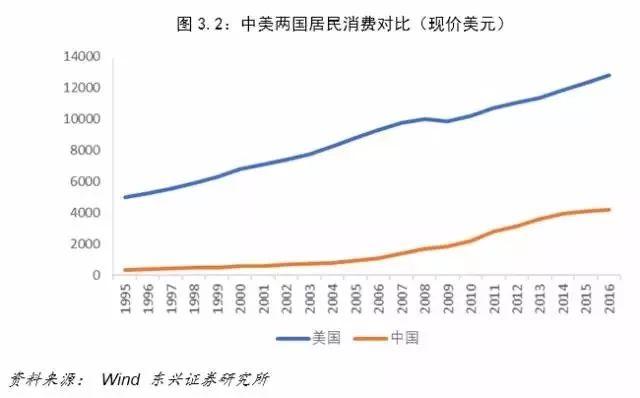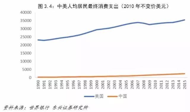 从人均居民最终消费支出来看,根据世界银行的统计,按照2010年不变价美元计算,1990年以来,美国的人均居民最终消费支出从23100.42美元上升至2015年的35525.67美元,而中国仅从1990年的205.80美元上升至2015年的2401.70美元,两国的绝对差距扩大。综上所述,中美两国居民消费水平的差距十分明显。