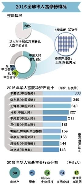 相比中国大陆“首富轮流当”的格局,世界华人首富相对固定。4月20日,《福布斯》发布2015华人富豪榜,李嘉诚以净资产规模333亿美元再次蝉联第一,财富较去年增长了7.42%。